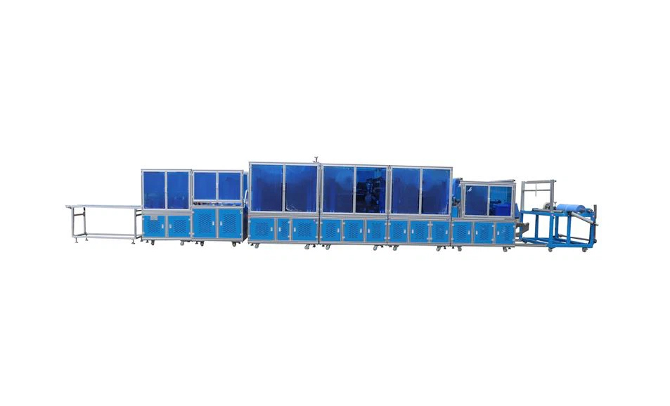 这是一款配备加固层喷胶装置的全自动PLC控制手术服制造机,可灵活调节手术服的长度与宽度。